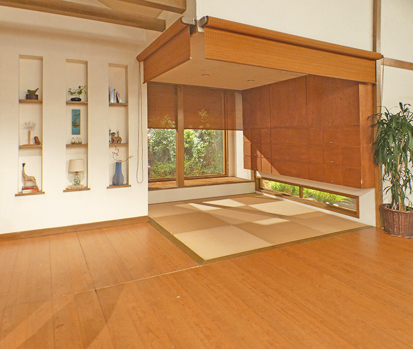 天然素材である木製の「経木すだれ」が、落ち着いた空間を醸し出しています。